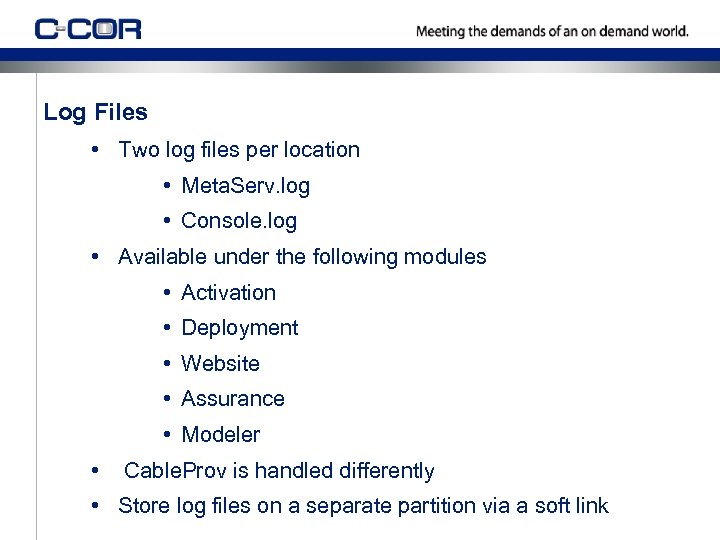 Log Files • Two log files per location • Meta. Serv. log • Console. log • Available under the following modules • Activation • Deployment • Website • Assurance • Modeler • Cable. Prov is handled differently • Store log files on a separate partition via a soft link