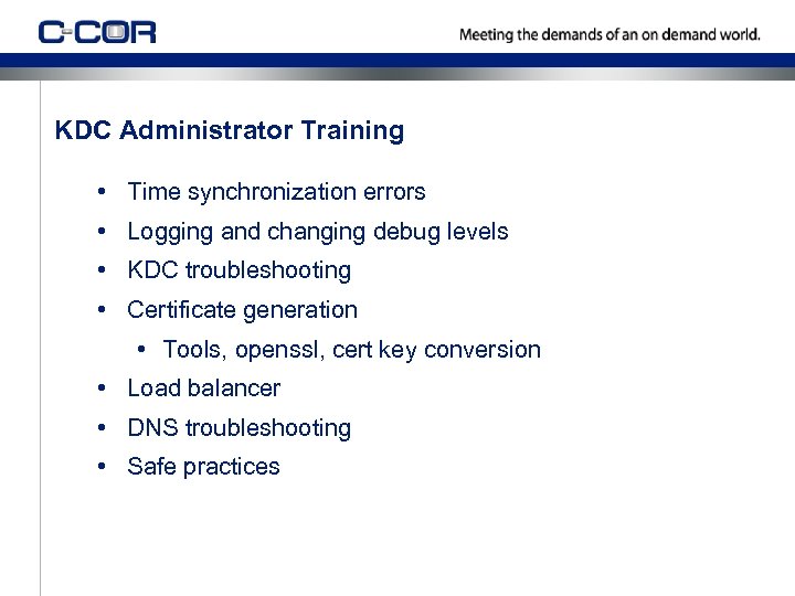 KDC Administrator Training • Time synchronization errors • Logging and changing debug levels • KDC troubleshooting • Certificate generation • Tools, openssl, cert key conversion • Load balancer • DNS troubleshooting • Safe practices