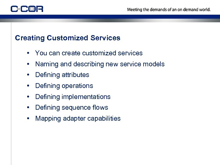Creating Customized Services • You can create customized services • Naming and describing new service models • Defining attributes • Defining operations • Defining implementations • Defining sequence flows • Mapping adapter capabilities