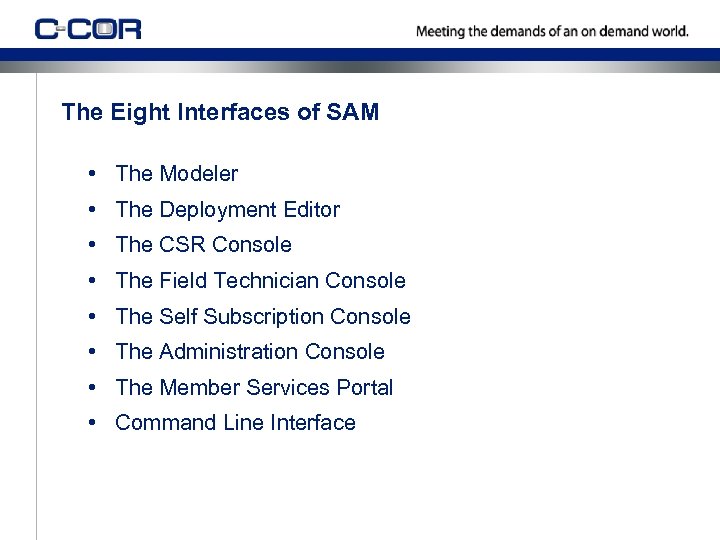 The Eight Interfaces of SAM • The Modeler • The Deployment Editor • The CSR Console • The Field Technician Console • The Self Subscription Console • The Administration Console • The Member Services Portal • Command Line Interface