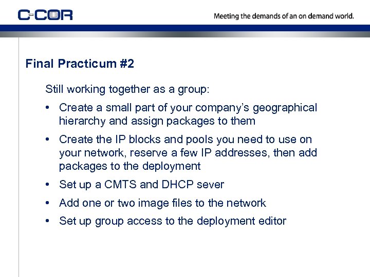 Final Practicum #2 Still working together as a group: • Create a small part of your company’s geographical hierarchy and assign packages to them • Create the IP blocks and pools you need to use on your network, reserve a few IP addresses, then add packages to the deployment • Set up a CMTS and DHCP sever • Add one or two image files to the network • Set up group access to the deployment editor