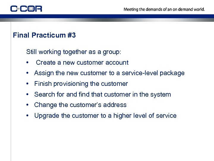 Final Practicum #3 Still working together as a group: • Create a new customer account • Assign the new customer to a service-level package • Finish provisioning the customer • Search for and find that customer in the system • Change the customer’s address • Upgrade the customer to a higher level of service