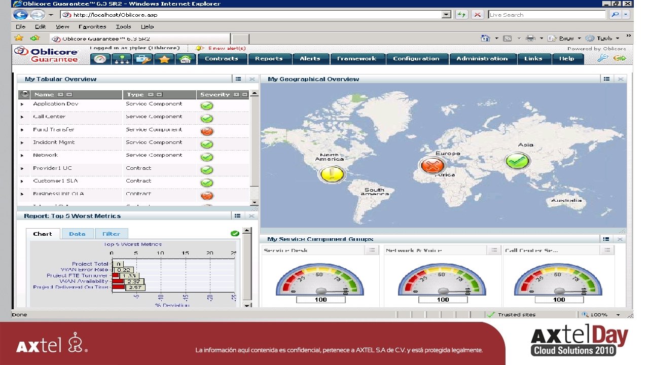 The Oblicore Concept – Report on the Services 4. Report Design Service Contract Publish • Compliance and Operational Reporting (SOX) • Dashboards with contractual and current status • Proactive alarms (predictive, trending, aggregated, . . . ) • Service feedback reporting
