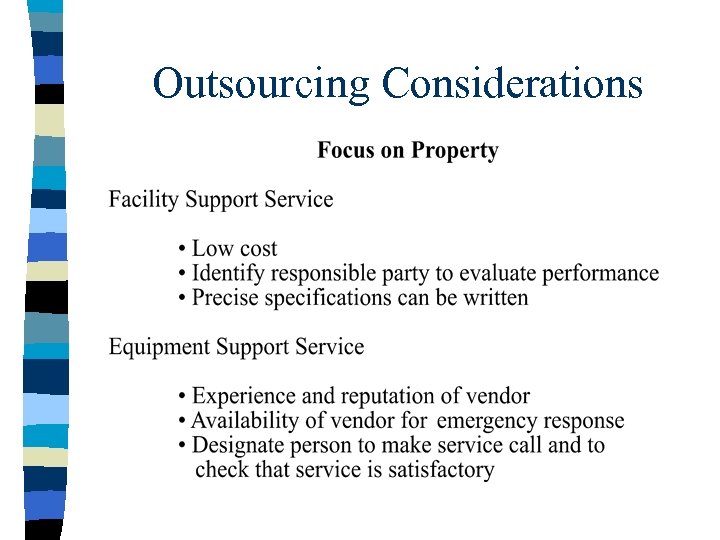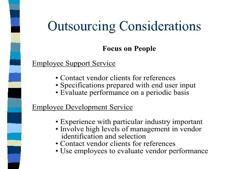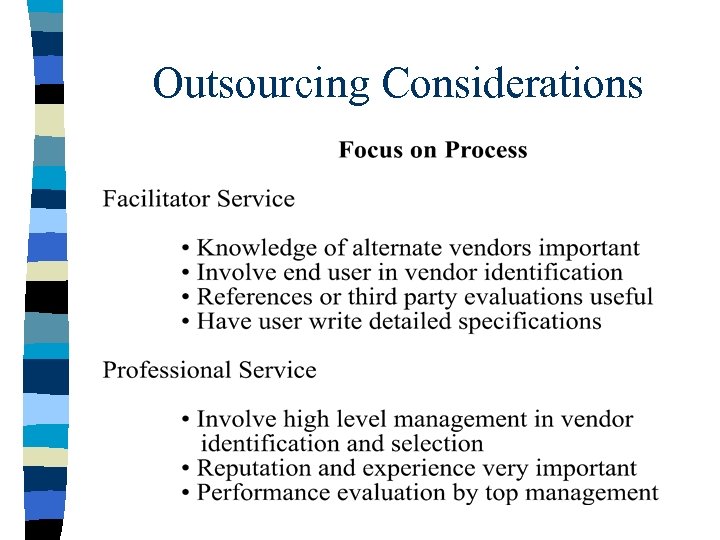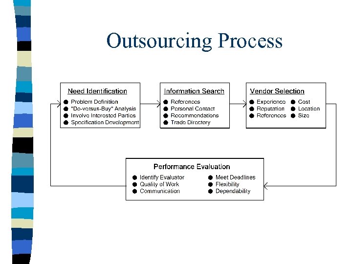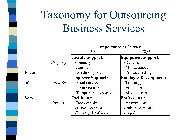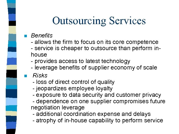 Outsourcing Services n n Benefits - allows the firm to focus on its core competence - service is cheaper to outsource than perform inhouse - provides access to latest technology - leverage benefits of supplier economy of scale Risks - loss of direct control of quality - jeopardizes employee loyalty - exposure to data security and customer privacy - dependence on one supplier compromises future negotiation leverage - additional coordination expense and delays - atrophy of in-house capability to perform service