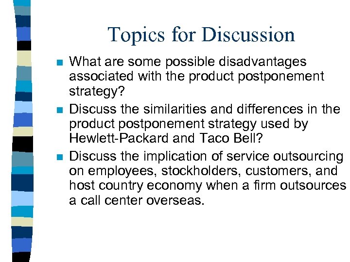 Topics for Discussion n What are some possible disadvantages associated with the product postponement strategy? Discuss the similarities and differences in the product postponement strategy used by Hewlett-Packard and Taco Bell? Discuss the implication of service outsourcing on employees, stockholders, customers, and host country economy when a firm outsources a call center overseas.