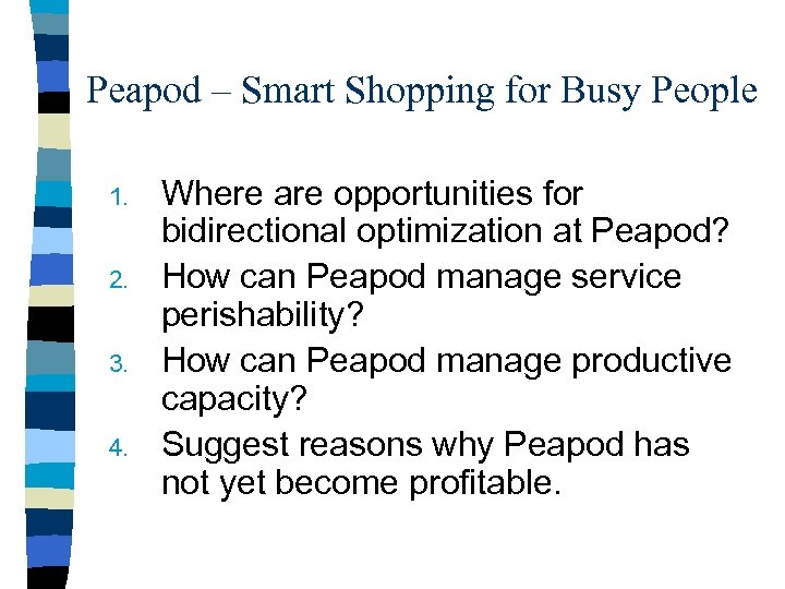 Peapod – Smart Shopping for Busy People 1. 2. 3. 4. Where are opportunities for bidirectional optimization at Peapod? How can Peapod manage service perishability? How can Peapod manage productive capacity? Suggest reasons why Peapod has not yet become profitable.
