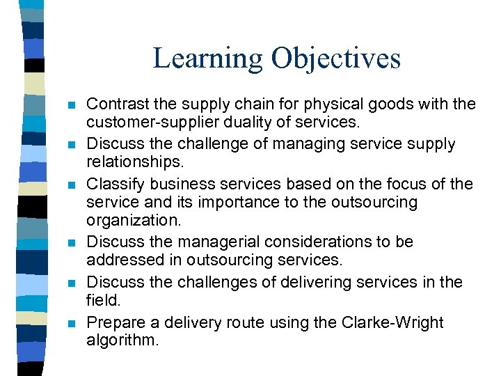 Learning Objectives n n n Contrast the supply chain for physical goods with the customer-supplier duality of services. Discuss the challenge of managing service supply relationships. Classify business services based on the focus of the service and its importance to the outsourcing organization. Discuss the managerial considerations to be addressed in outsourcing services. Discuss the challenges of delivering services in the field. Prepare a delivery route using the Clarke-Wright algorithm.