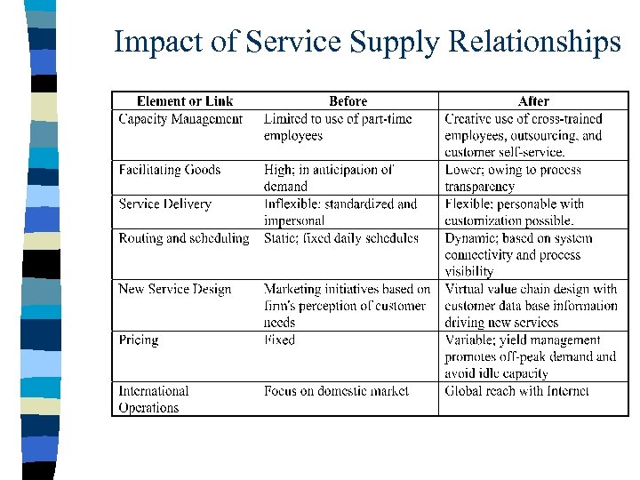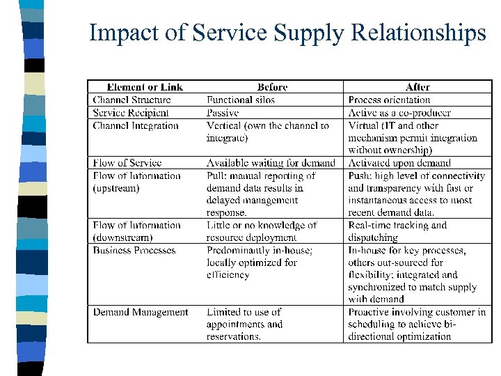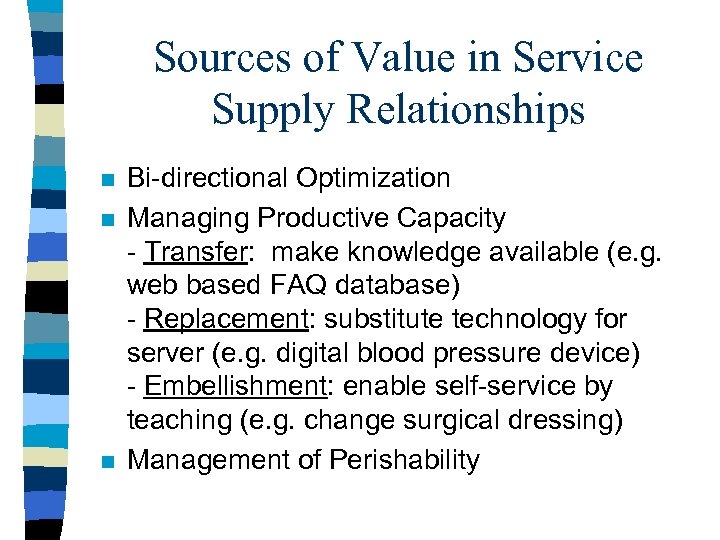 Sources of Value in Service Supply Relationships n n n Bi-directional Optimization Managing Productive Capacity - Transfer: make knowledge available (e. g. web based FAQ database) - Replacement: substitute technology for server (e. g. digital blood pressure device) - Embellishment: enable self-service by teaching (e. g. change surgical dressing) Management of Perishability