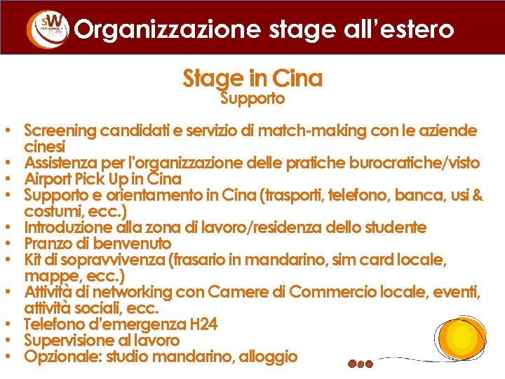 Organizzazione stage all’estero Stage in Cina Supporto • Screening candidati e servizio di match-making con le aziende cinesi • Assistenza per l’organizzazione delle pratiche burocratiche/visto • Airport Pick Up in Cina • Supporto e orientamento in Cina (trasporti, telefono, banca, usi & costumi, ecc. ) • Introduzione alla zona di lavoro/residenza dello studente • Pranzo di benvenuto • Kit di sopravvivenza (frasario in mandarino, sim card locale, mappe, ecc. ) • Attività di networking con Camere di Commercio locale, eventi, attività sociali, ecc. • Telefono d’emergenza H 24 • Supervisione al lavoro • Opzionale: studio mandarino, alloggio