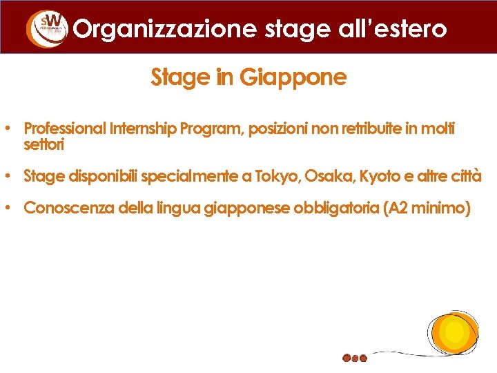 Organizzazione stage all’estero Stage in Giappone • Professional Internship Program, posizioni non retribuite in molti settori • Stage disponibili specialmente a Tokyo, Osaka, Kyoto e altre città • Conoscenza della lingua giapponese obbligatoria (A 2 minimo)