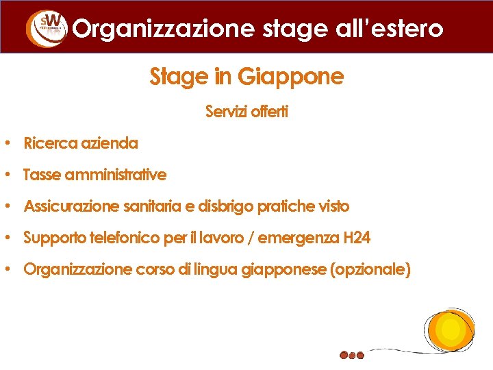 Organizzazione stage all’estero Stage in Giappone Servizi offerti • Ricerca azienda • Tasse amministrative • Assicurazione sanitaria e disbrigo pratiche visto • Supporto telefonico per il lavoro / emergenza H 24 • Organizzazione corso di lingua giapponese (opzionale)