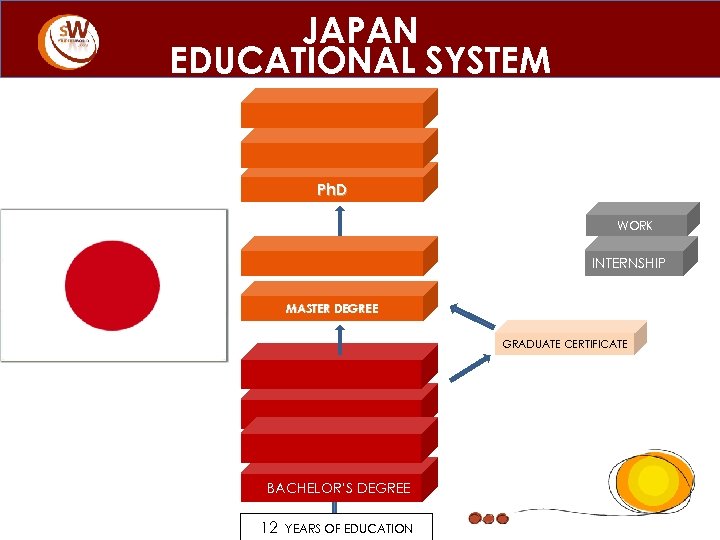 JAPAN EDUCATIONAL SYSTEM Ph. D WORK 2° YEAR MASTERS IN RESEARCH INTERNSHIP MASTER DEGREE GRADUATE CERTIFICATE BACHELOR’S DEGREE 12 YEARS OF EDUCATION