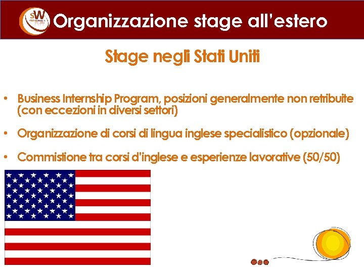 Organizzazione stage all’estero Stage negli Stati Uniti • Business Internship Program, posizioni generalmente non retribuite (con eccezioni in diversi settori) • Organizzazione di corsi di lingua inglese specialistico (opzionale) • Commistione tra corsi d’inglese e esperienze lavorative (50/50)