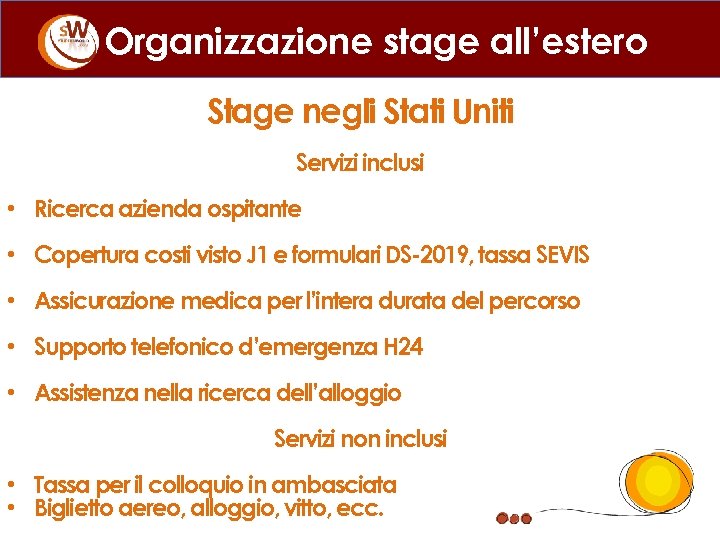 Organizzazione stage all’estero Stage negli Stati Uniti Servizi inclusi • Ricerca azienda ospitante • Copertura costi visto J 1 e formulari DS-2019, tassa SEVIS • Assicurazione medica per l’intera durata del percorso • Supporto telefonico d’emergenza H 24 • Assistenza nella ricerca dell’alloggio Servizi non inclusi • Tassa per il colloquio in ambasciata • Biglietto aereo, alloggio, vitto, ecc.