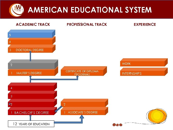AMERICAN EDUCATIONAL SYSTEM ACADEMIC TRACK PROFESSIONAL TRACK EXPERIENCE 5 4 3 DOCTORAL DEGREE WORK 2 1 CERTIFICATE OR DIPLOMA PROGRAMS MASTER’S DEGREE 4 3 22 2 1 BACHELOR’S DEGREE 12 YEARS OF EDUCATION 1 ASSOCIATE’S DEGREE INTERNSHIPS