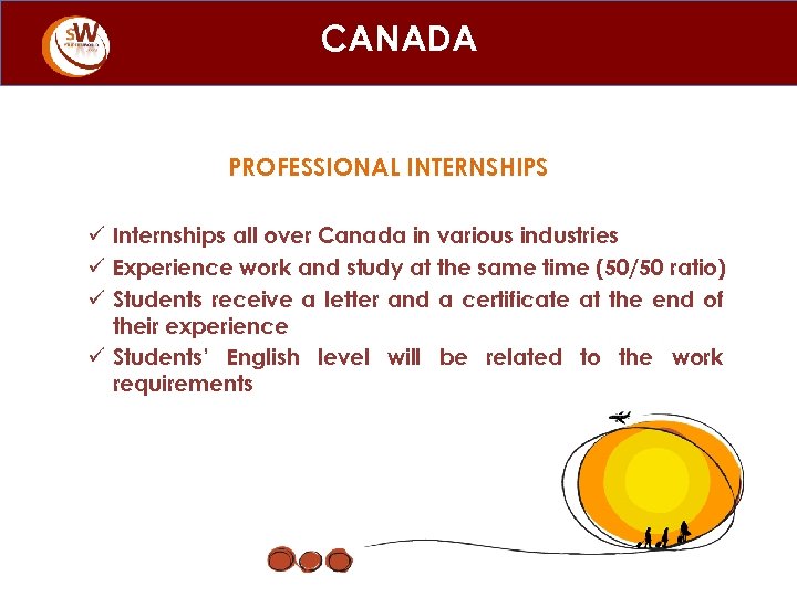 CANADA PROFESSIONAL INTERNSHIPS ü Internships all over Canada in various industries ü Experience work and study at the same time (50/50 ratio) ü Students receive a letter and a certificate at the end of their experience ü Students’ English level will be related to the work requirements