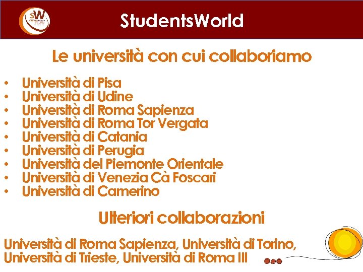 Students. World Le università con cui collaboriamo • • • Università di Pisa Università di Udine Università di Roma Sapienza Università di Roma Tor Vergata Università di Catania Università di Perugia Università del Piemonte Orientale Università di Venezia Cà Foscari Università di Camerino Ulteriori collaborazioni Università di Roma Sapienza, Università di Torino, Università di Trieste, Università di Roma III