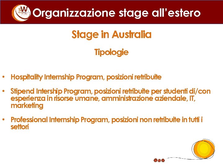Organizzazione stage all’estero Stage in Australia Tipologie • Hospitality Internship Program, posizioni retribuite • Stipend Intership Program, posizioni retribuite per studenti di/con esperienza in risorse umane, amministrazione aziendale, IT, marketing • Professional Internship Program, posizioni non retribuite in tutti i settori