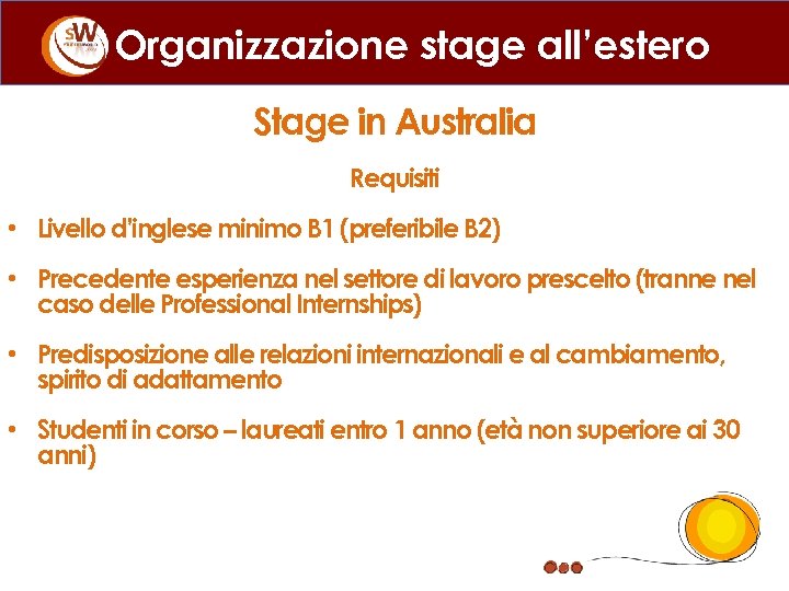 Organizzazione stage all’estero Stage in Australia Requisiti • Livello d’inglese minimo B 1 (preferibile B 2) • Precedente esperienza nel settore di lavoro prescelto (tranne nel caso delle Professional Internships) • Predisposizione alle relazioni internazionali e al cambiamento, spirito di adattamento • Studenti in corso – laureati entro 1 anno (età non superiore ai 30 anni)