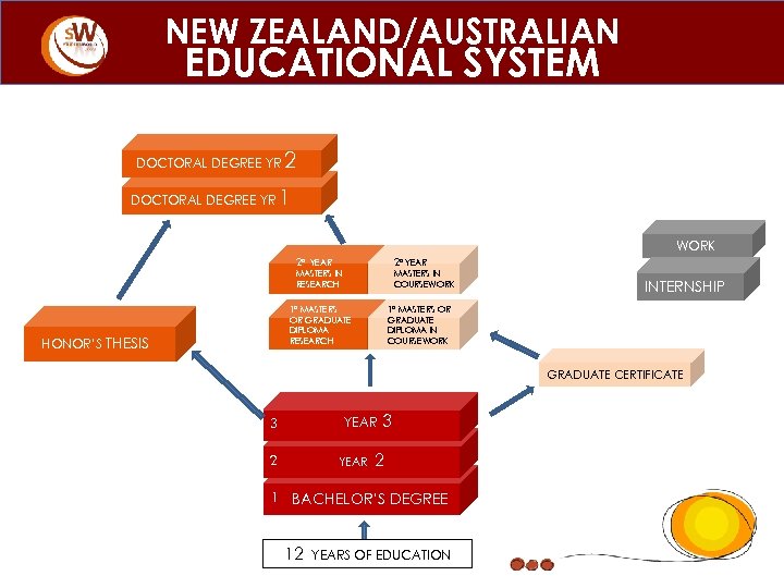NEW ZEALAND/AUSTRALIAN EDUCATIONAL SYSTEM DOCTORAL DEGREE YR 2 1 WORK 2° 2° YEAR MASTERS IN RESEARCH MASTERS IN COURSEWORK 1° MASTERS OR GRADUATE DIPLOMA RESEARCH HONOR’S THESIS INTERNSHIP 1° MASTERS OR GRADUATE DIPLOMA IN COURSEWORK GRADUATE CERTIFICATE YEAR 3 2 1 YEAR 3 2 BACHELOR’S DEGREE 12 YEARS OF EDUCATION