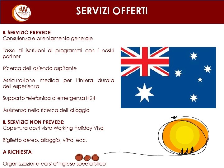 SERVIZI OFFERTI IL SERVIZIO PREVEDE: Consulenza e orientamento generale Tasse di iscrizioni ai programmi con i nostri partner Ricerca dell’azienda ospitante Assicurazione medica per l’intera durata dell’esperienza Supporto telefonica d’emergenza H 24 Assistenza nella ricerca dell’alloggio IL SERVIZIO NON PREVEDE: Copertura costi visto Working Holiday Visa Biglietto aereo, alloggio, vitto, ecc. A RICHIESTA: Organizzazione corsi d’inglese specialistico