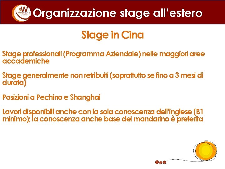 Organizzazione stage all’estero Stage in Cina Stage professionali (Programma Aziendale) nelle maggiori aree accademiche Stage generalmente non retribuiti (soprattutto se fino a 3 mesi di durata) Posizioni a Pechino e Shanghai Lavori disponibili anche con la sola conoscenza dell’inglese (B 1 minimo); la conoscenza anche base del mandarino è preferita