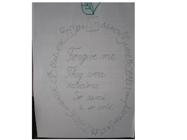 William Carlos Williams Organize the poem into a meaningful shape: This is just to say I have eaten the plums that were in the icebox and which you were probably saving for breakfast Forgive me they were delicious so sweet and so cold