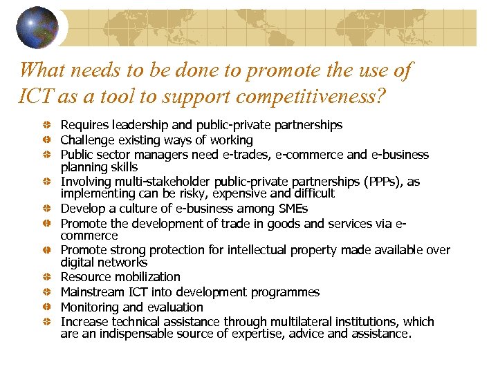 What needs to be done to promote the use of ICT as a tool to support competitiveness? Requires leadership and public-private partnerships Challenge existing ways of working Public sector managers need e-trades, e-commerce and e-business planning skills Involving multi-stakeholder public-private partnerships (PPPs), as implementing can be risky, expensive and difficult Develop a culture of e-business among SMEs Promote the development of trade in goods and services via ecommerce Promote strong protection for intellectual property made available over digital networks Resource mobilization Mainstream ICT into development programmes Monitoring and evaluation Increase technical assistance through multilateral institutions, which are an indispensable source of expertise, advice and assistance.