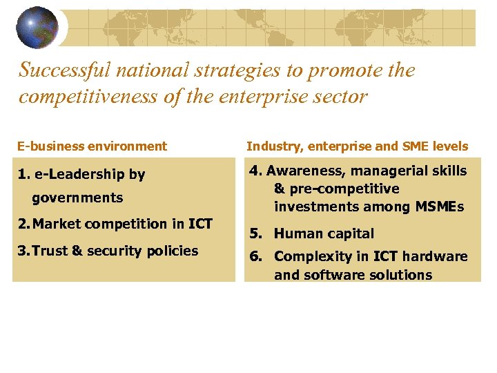 Successful national strategies to promote the competitiveness of the enterprise sector E-business environment Industry, enterprise and SME levels 1. e-Leadership by 4. Awareness, managerial skills & pre-competitive investments among MSMEs governments 2. Market competition in ICT 3. Trust & security policies 5. Human capital 6. Complexity in ICT hardware and software solutions