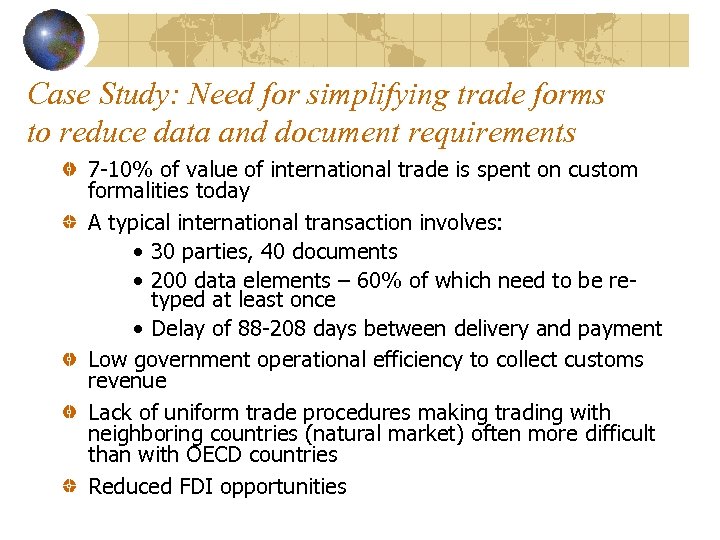Case Study: Need for simplifying trade forms to reduce data and document requirements 7 -10% of value of international trade is spent on custom formalities today A typical international transaction involves: • 30 parties, 40 documents • 200 data elements – 60% of which need to be retyped at least once • Delay of 88 -208 days between delivery and payment Low government operational efficiency to collect customs revenue Lack of uniform trade procedures making trading with neighboring countries (natural market) often more difficult than with OECD countries Reduced FDI opportunities