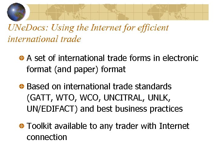 UNe. Docs: Using the Internet for efficient international trade A set of international trade forms in electronic format (and paper) format Based on international trade standards (GATT, WTO, WCO, UNCITRAL, UNLK, UN/EDIFACT) and best business practices Toolkit available to any trader with Internet connection