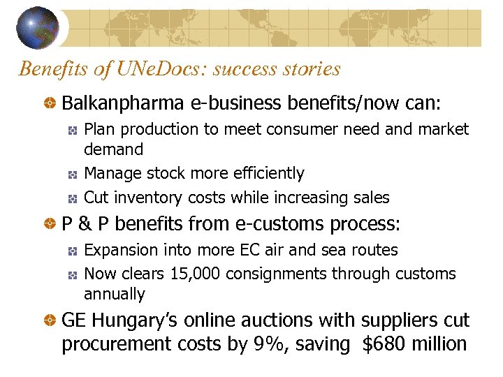 Benefits of UNe. Docs: success stories Balkanpharma e-business benefits/now can: Plan production to meet consumer need and market demand Manage stock more efficiently Cut inventory costs while increasing sales P & P benefits from e-customs process: Expansion into more EC air and sea routes Now clears 15, 000 consignments through customs annually GE Hungary’s online auctions with suppliers cut procurement costs by 9%, saving $680 million