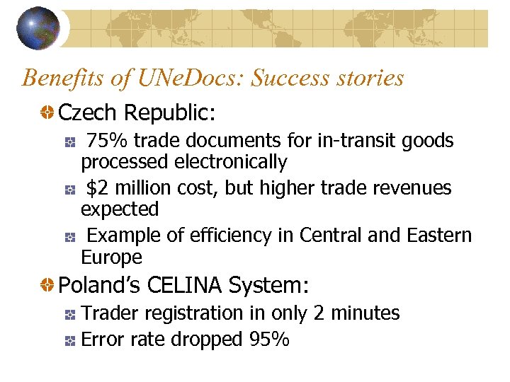 Benefits of UNe. Docs: Success stories Czech Republic: 75% trade documents for in-transit goods processed electronically $2 million cost, but higher trade revenues expected Example of efficiency in Central and Eastern Europe Poland’s CELINA System: Trader registration in only 2 minutes Error rate dropped 95%