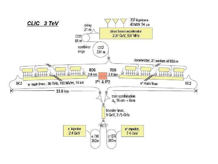 CLIC Parameters @ 3 Te. V Center of mass energy Ecm 3000 Ge. V Main Linac RF Frequency f. RF 30 GHz Luminosity L 6. 5 1034 cm-2 s-1 Luminosity (in 1% of energy) L 99% 3. 3 1034 cm-2 s-1 Linac repetition rate frep 150 Hz No. of particles / bunch Nb 2. 56 109 No. of bunches / pulse kb 220 Bunch separation Δtb 0. 267 (8 periods) ns Bunch train length τtrain 58. 4 ns Pb 20. 4 MW Unloaded / loaded gradient Gunl/l 172 / 150 MV/m Overall two linac length llinac 28 km Total beam delivery length l. BD 2 x 2. 6 km Proposed site length ltot 33. 2 km Total site AC power Ptot 418 MW Wall plug (RF) to main beam power efficiency ηtot 12. 5 % Beam power / beam