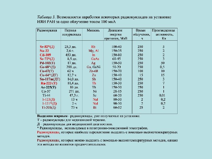 Существующие установки для производства радиоизотопов на интенсивном пучке протонов средних энергий • Институт ядерных исследований РАН (Троицк) 160 Мэ. В, 120 мк. A • Los Alamos National Laboratory (NM, USA) 100 Мэ. В, 100 -200 мк. A • Brookhaven National Laboratory (NY, USA) 200 Мэ. В, 80 мк. A • TRIUMF (Vancouver, Canada) 110 Mэ. В, 50 мк. A • i. Themba Laboratory (Cape Town, South Africa) 66 Mэ. В, 70 -… мк. A + ARRONAX, (Nant, France) 70 Mэ. В, 100 -300 мк. А