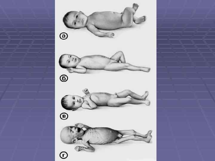 Паратрофия клиника § Толщина подкожной клетчатки увеличена, особенно на животе и в § § § § области бедер Рост ребенка соответствует возрасту. Кожа бледная, сухая. Тургор тканей и тонус мышц снижен. Психомоторное развитие несколько задерживается Эмоциональная лабильность, нарушение сна, снижение аппетита. Стул неустойчивый, испражнения жидкие с примесью зелени и слизи Ребенок часто болеет острыми респираторными вирусными заболеваниями, которые принимают затяжное течение и нередко осложняются отитом, пневмонией. При инф. болезнях масса тела быстро уменьшается.