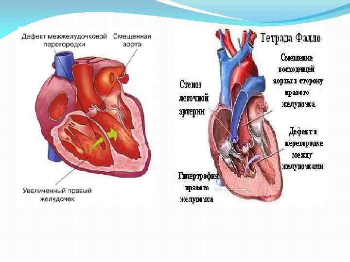 Тетрада Фалло Порок включает сочетание четырёх аномалий: 1 – стеноз легочной артерии; 2 – дефект межжелудочковой перегородки; 3 – транспозиция аорты вправо; 4 – гипертрофия правого желудочка. МКК недостаточно обеспечивается кровью, в БКК через аорту, которая располагается над дефектом в межжелудочковой перегородке, поступает смешанная кровь – артериальная из левого и венозная из правого желудочка. В связи с сужением легочной артерии и повышенным давлением в аорте правый желудочек гипертрофируется.