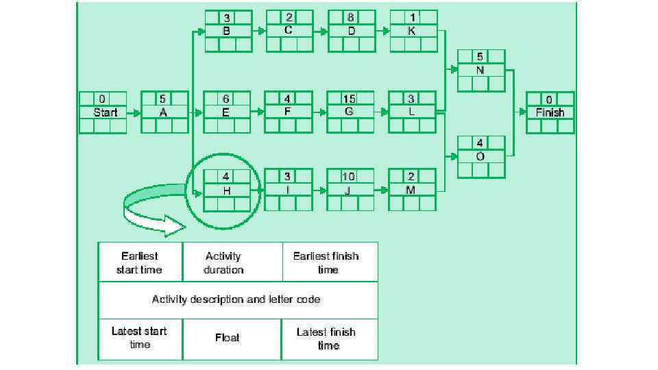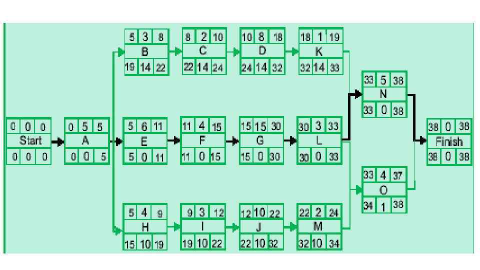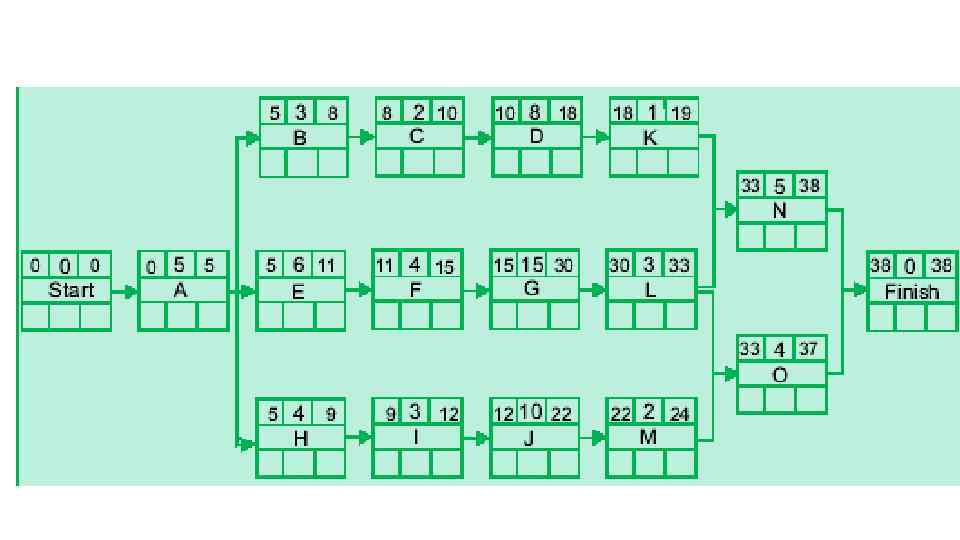 Методика расчета • • • Определяется длительность каждой работы Определяются ранние старты и ранние окончания ( «прямой» проход) Вычисляется критический путь (наиболее «длинный» ) Определяются поздние старты и поздние окончания ( «обратный» проход) Определяется вариация (зазор) интервала выполнения задачи (зазор – slack) Полученная модель используется для управления Основное правило: Работы, которые требуют завершения одной или более предшествующих работ, могут стартовать не ранее завершения самой поздней из них