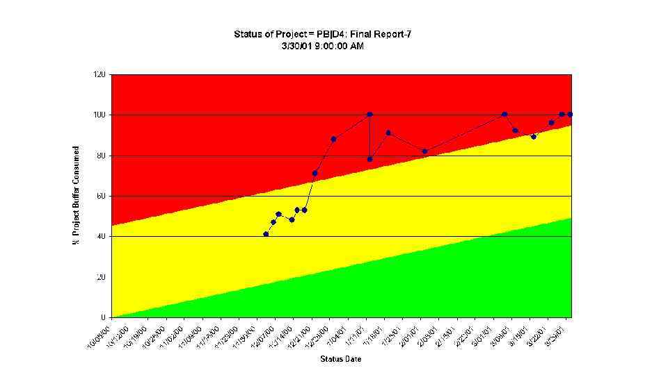 Отслеживание проекта • Для каждого задания собирайте: • Дату реального старта • Оставшееся время • Реальную дату завершения • Рассчитайте воздействие на проект и питающие буферы • Если задание выполнено позже или запаздывает, используйте соответствующий буфер. Найдите причину задержки. • Если задание выполнено раньше восполните соответствующий буфер. • Отслеживайте буферы запаса времени • Используйте «жаркий графики» для отслеживание проекта (см. след. слайд).