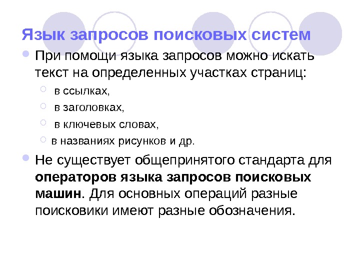 Язык запросов поисковых систем При помощи языка запросов можно искать текст на определенных участках страниц: в ссылках, в заголовках, в ключевых словах, в названиях рисунков и др. Не существует общепринятого стандарта для операторов языка запросов поисковых машин. Для основных операций разные поисковики имеют разные обозначения.