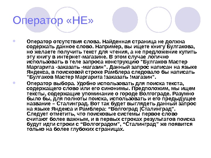 Оператор «НЕ» Оператор отсутствия слова. Найденная страница не должна содержать данное слово. Например, вы ищете книгу Булгакова, но желаете получить текст для чтения, а не предложение купить эту книгу в интернет-магазине. В этом случае логично использовать в теле запроса конструкцию «Булгаков Мастер Маргарита -заказать -магазин». Данный запрос написан на языке Яндекса, в поисковой строке Рамблера следовало бы написать «Булгаков Мастер Маргарита !заказать !магазин». Оператор выбора. Удобно использовать для поиска текста, содержащего слово или его синонимы. Предположим, мы ищем тексты, содержащие упоминание о городе Волгограде. Разумно было бы, для полноты поиска, использовать и его предыдущее название – Сталинград. Вот так будет выглядеть данный запрос на языке Яндекса и Рамблера: “Волгоград |Сталинград”. Следует отметить, что поисковые системы первое слово считают более важным, и в первых строках результатов поиска будут идти строки с “Волгоградом”, “Сталинград” же появится только на более глубоких страницах.