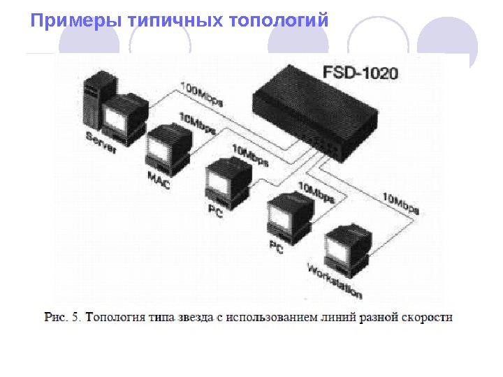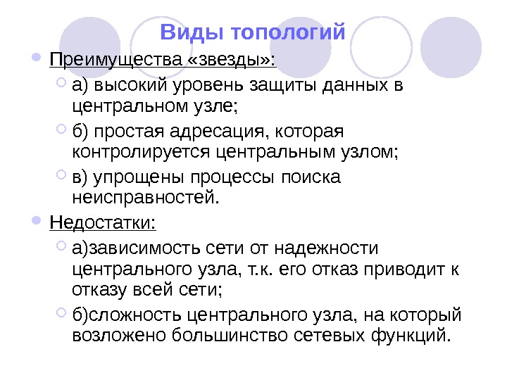 Виды топологий Преимущества «звезды» : а) высокий уровень защиты данных в центральном узле; б) простая адресация, которая контролируется центральным узлом; в) упрощены процессы поиска неисправностей. Недостатки: а)зависимость сети от надежности центрального узла, т. к. его отказ приводит к отказу всей сети; б)сложность центрального узла, на который возложено большинство сетевых функций.