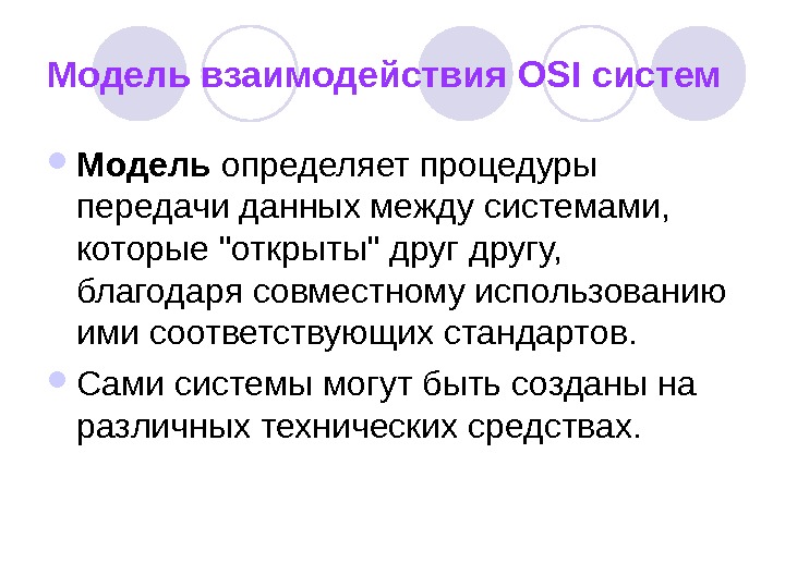 Модель взаимодействия OSI систем Модель определяет процедуры передачи данных между системами, которые «открыты» другу, благодаря совместному использованию ими соответствующих стандартов. Сами системы могут быть созданы на различных технических средствах.