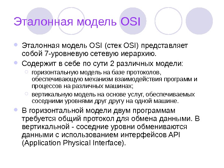 Эталонная модель OSI ( стек OSI ) представляет собой 7 -уровневую сетевую иерархию. Содержит в себе по сути 2 различных модели: горизонтальную модель на базе протоколов, обеспечивающую механизм взаимодействия программ и процессов на различных машинах; вертикальную модель на основе услуг, обеспечиваемых соседними уровнями другу на одной машине. В горизонтальной модели двум программам требуется общий протокол для обмена данными. В вертикальной — соседние уровни обмениваются данными с использованием интерфейсов API (Application Physical Interface).