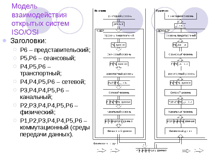 Модель взаимодействия открытых систем ISO/OSI Заголовки: P 6 – представительский; P 5, P 6 – сеансовый; P 4, P 5, P 6 – транспортный; P 4, P 5, P 6 – сетевой; P 3, P 4, P 5, P 6 – канальный; P 2, P 3, P 4, P 5, P 6 – физический; P 1, P 2, P 3, P 4, P 5, P 6 – коммутационный (среды передачи данных).