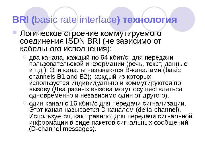 BRI ( basic rate interface ) технология Логическое строение коммутируемого соединения ISDN BRI (не зависимо от кабельного исполнения): два канала, каждый по 64 кбит/с, для передачи пользовательской информации (речь, текст, данные и т. д. ). Эти каналы называются В-каналами (basic channels B 1 and B 2); каждый из которых используется индивидуально и коммутируются по вызову (Два разных вызова могут осуществляться одновременно и независимо один от другого). один канал с 16 кбит/с для передачи сигнализации. Этот канал называется D-каналом (delta-channel). Используется, как правило, для передачи сигнальной информации в виде пакетов сигнальных сообщений (D-channel messages).