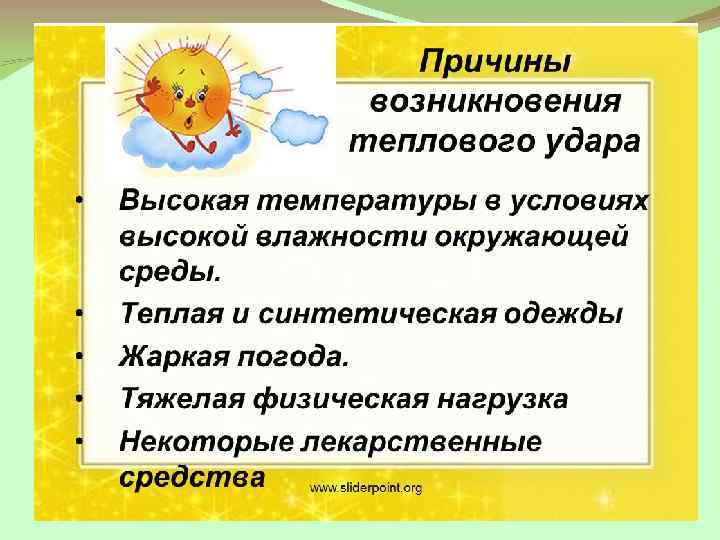 Тепловой удар. Это болезненное состояние, обусловленное перегреванием организма и возникающее в результате воздействия внешних тепловых факторов.