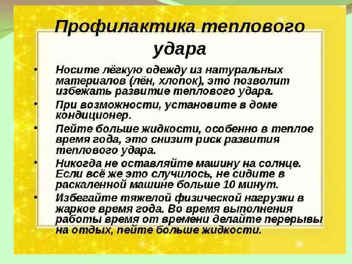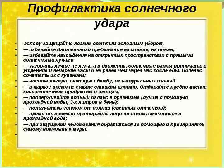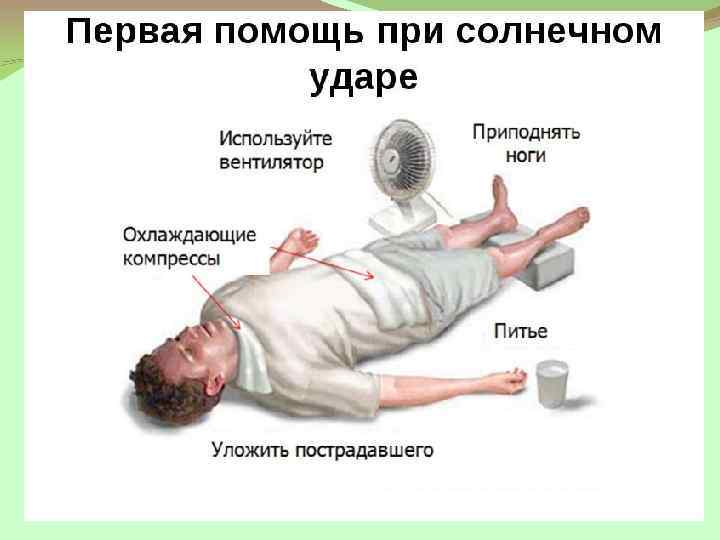 Первая помощь при солнечном ударе. 1. Перенести пострадавшего в тень; 2. Приподнять ноги; 3. Смочить лицо холодной водой; 4. Напоить прохладной водой; 5. Дать доступ кислорода; 6. При необходимости закрытый массаж сердца и ИВЛ; 7. Вызвать бригаду скорой помощи.