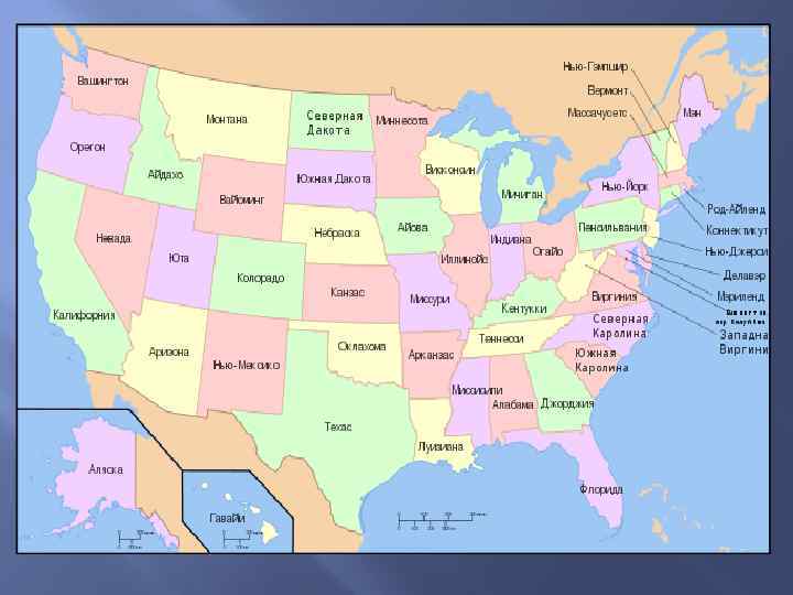 Региональные различия в современной Северной Америке В настоящее время (с 1960 г. ) Бюро переписей США выделяет 4 региона и 9 районов страны: I. Северо-Восток 1. Новая Англия - 6 штатов: Вермонт, Коннектикут, Массачусетс, Мэн, Нью-Хемпшир и Род-Айленд. 2. Средне-Атлантические штаты - 3 штата: Нью. Йорк, Нью-Джерси и Пенсильвания.