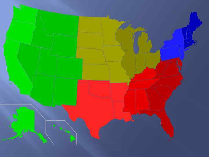 IV. Запад 8. Горные штаты 8 штатов – Монтана, Айдахо, Вайоминг, Юта, Колорадо, Невада, Аризона и Нью. Мексико. 9. Тихоокеанские штаты 5 штатов – Вашингтон, Орегон, Калифорния, Аляска и Гавайи.